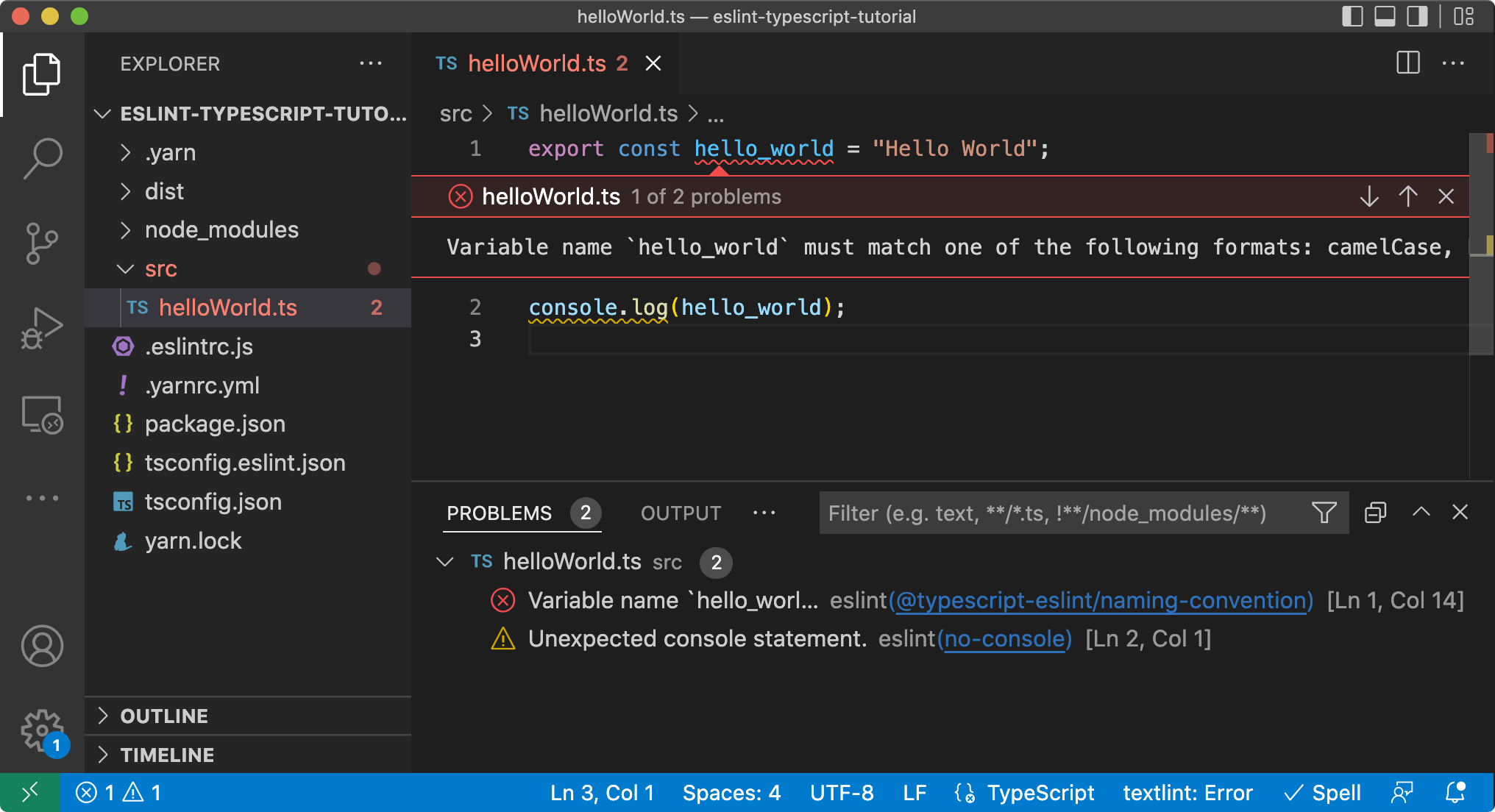 このhello-world.tsは、わざとコーディング規約に違反するコードになっています。1行目の変数hello_worldはキャメルケースになっていません。2行目では、使ってはいけないconsole.logが使われています。